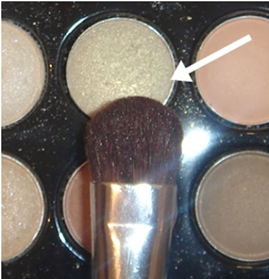 2 – Aplique uma fina camada de sombra pérola com leve cintilância dourada em toda pálpebra móvel, da raiz dos cílios à raiz da sobrancelha. Use pincel de sua preferência ou aplicador (esponjinha):
